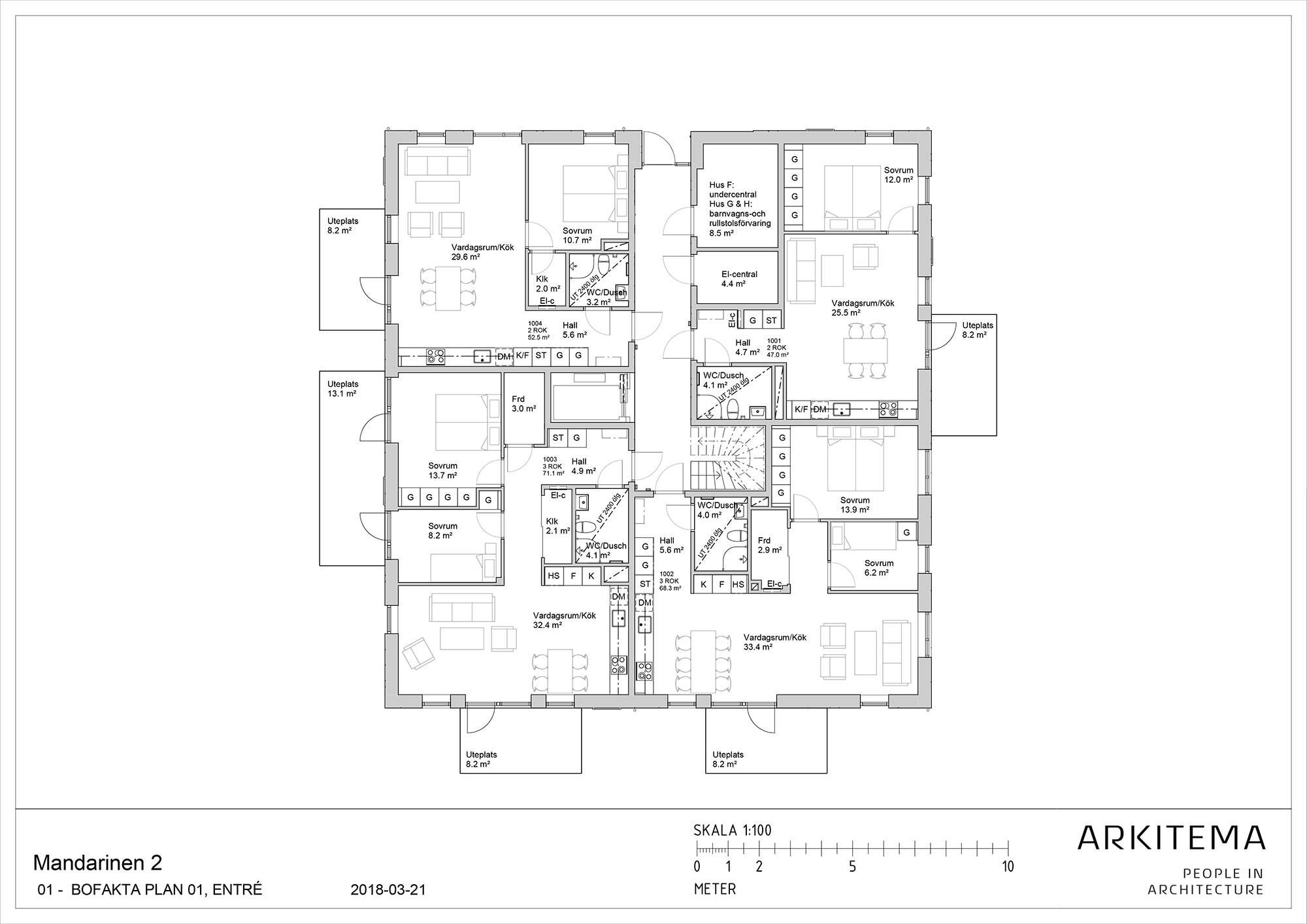 Husen är byggda som punkthus där lägenheterna omsluter de gemensamma trapphuset.