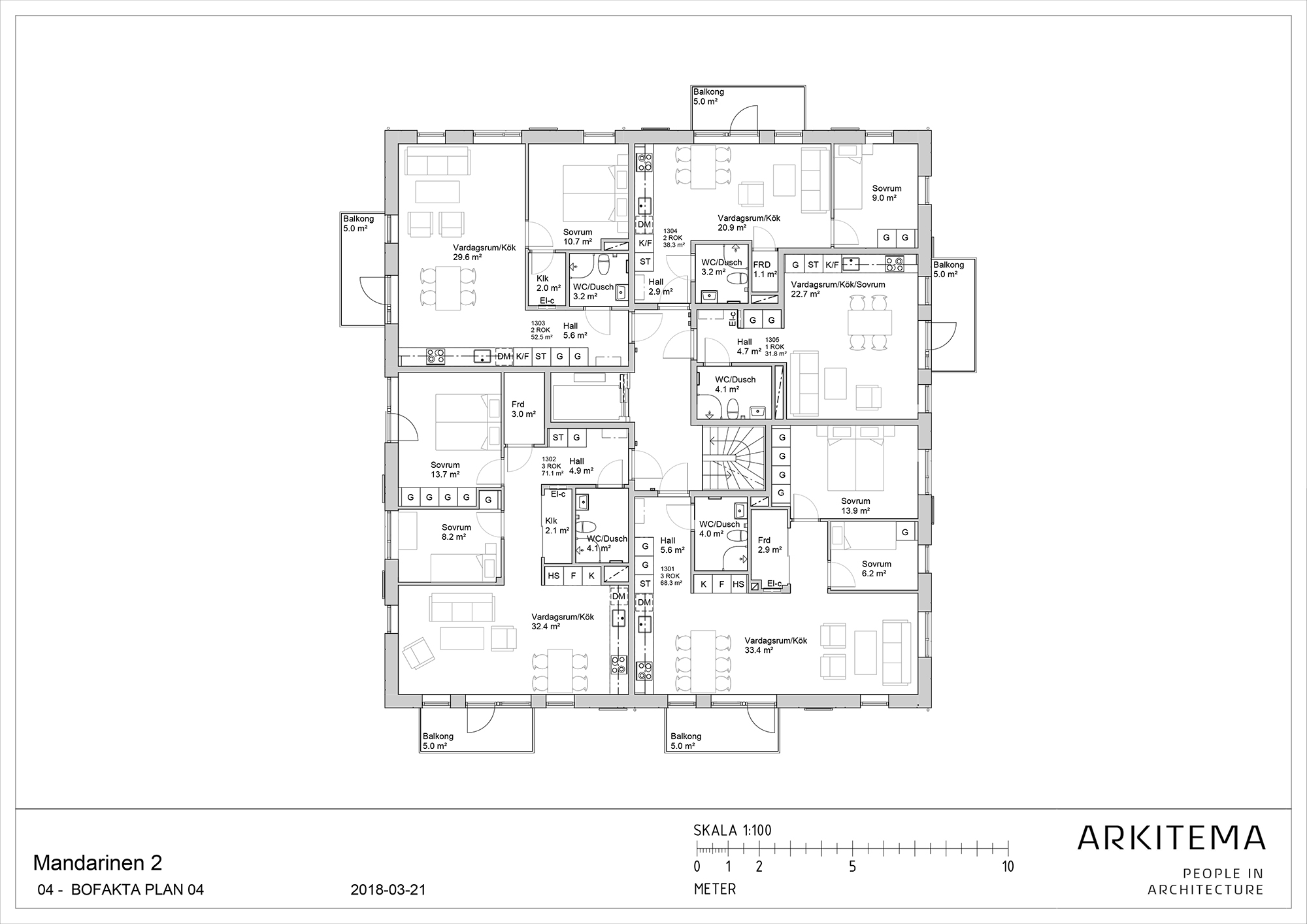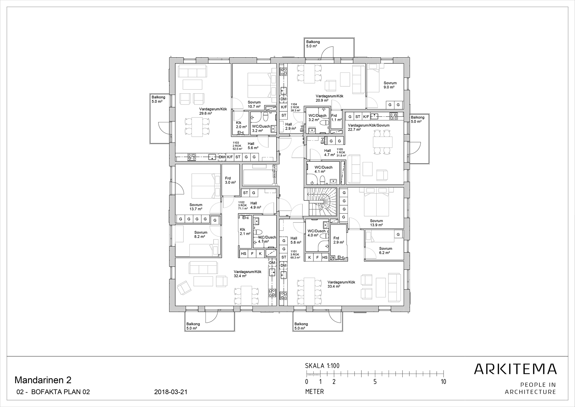 På varje våningsplan finns en 1:a, två 2:or och två 3:or, förutom på markplan som saknar en 1:a. På det översta, halva våningsplanet, finns två lite större 2:or.